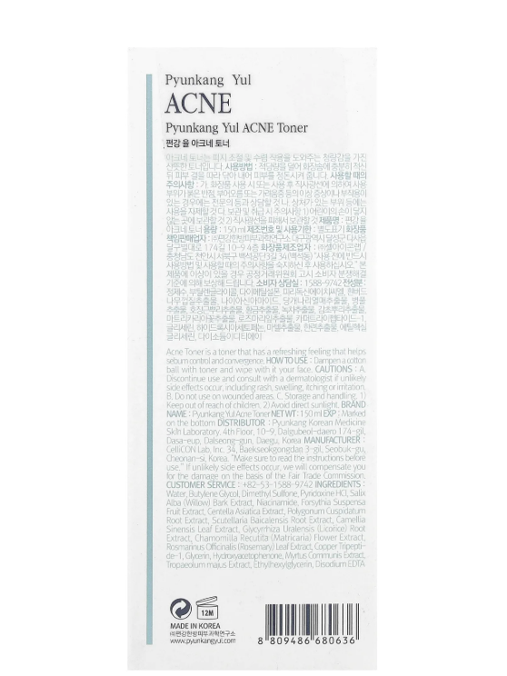 편강율 아크네 토너 150ml (Pyunkang Yul ACNE Toner)에 대한 정보입니다. 이 제품은 여드름 및 민감성 피부를 위해 특별히 고안된 순한 약산성 토너입니다.