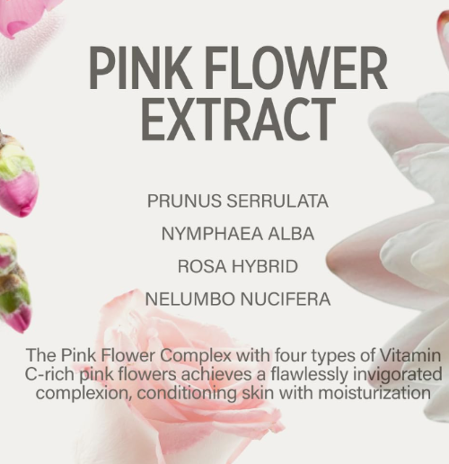 - Pink Flower Complex: Contains extracts from cherry blossoms, water lilies, roses, and lotus flowers to provide antioxidant benefits, Vitamin C, and deep hydration.
