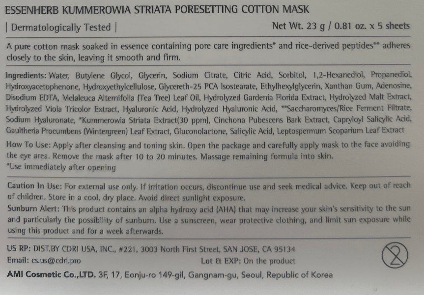 The EssenHerb Kummerowia Striata Pore Setting Cotton Mask is a functional skincare solution specifically designed for pore tightening and sebum control.