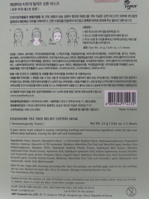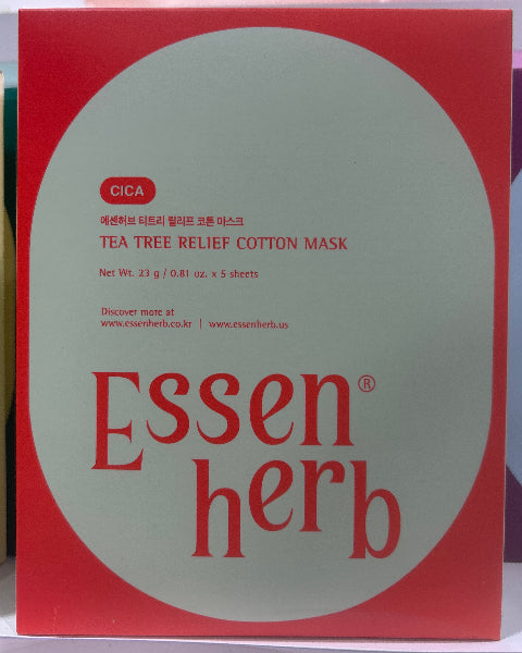 The essenHERB Tea Tree Relief Cotton Mask (25g x 5ea) is a vegan-certified sheet mask designed to provide immediate relief and hydration to sensitive or troubled skin.