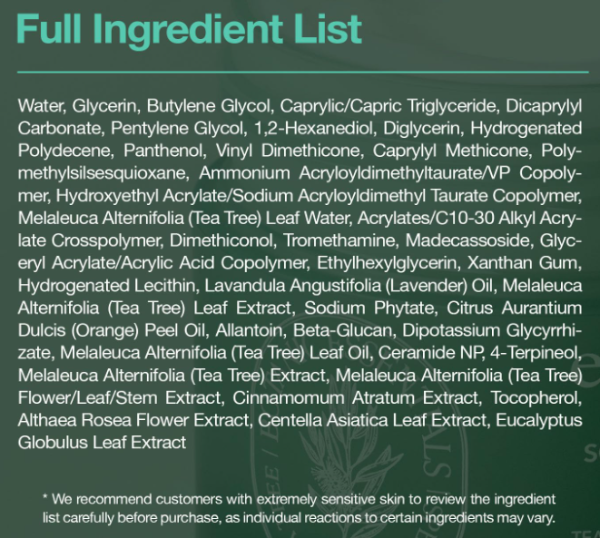 Key Ingredients: It contains Melaleuca Alternifolia (Tea Tree) Leaf Extract and Centella Asiatica Extract (cica ingredients) for soothing. It also includes ceramide and beta-glucan to provide deep moisture and strengthen the skin barrier.