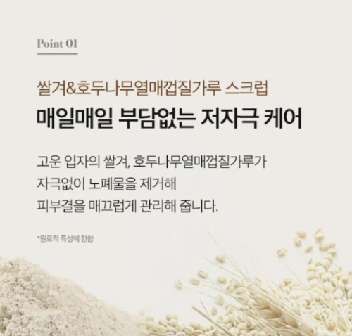 저자극 데일리 케어: 미세한 곡물 입자가 피부 자극을 최소화하며 블랙헤드와 피지 조절에 도움을 주어 매일 사용하기 적합합니다.