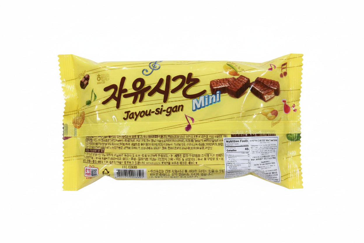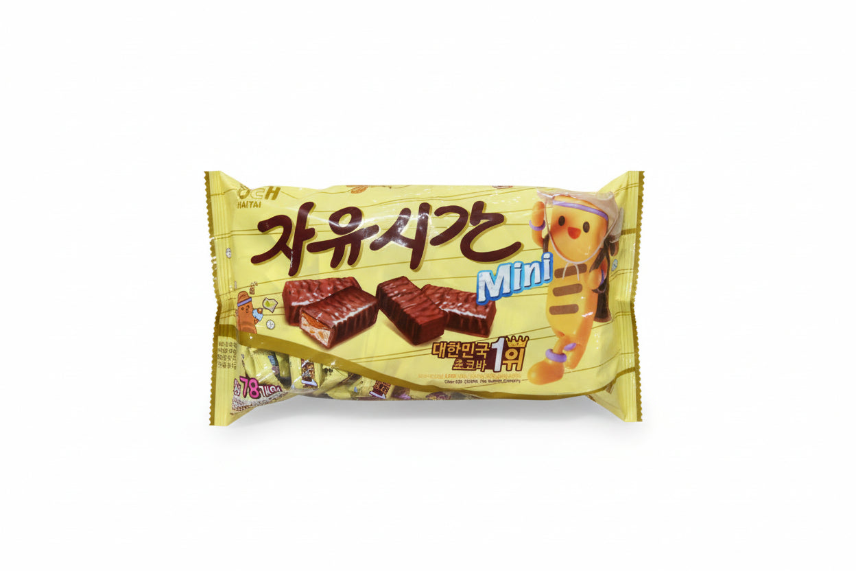 해태 미니 자유시간은 땅콩, 카라멜, 누가와 초콜릿의 조화로운 맛으로 유명한 인기 초코바입니다.