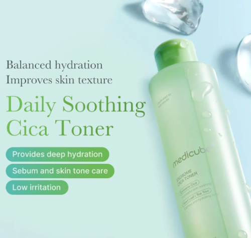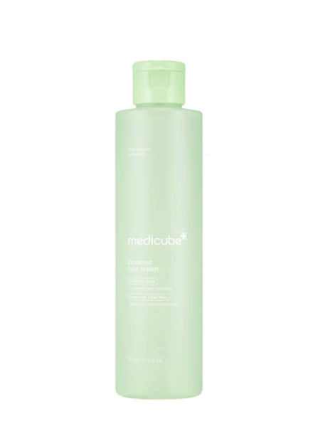The Medicube Exosome Cica Toner (210ml) is a daily soothing toner designed to calm irritation, control sebum, and strengthen the skin barrier through advanced nano-delivery technology