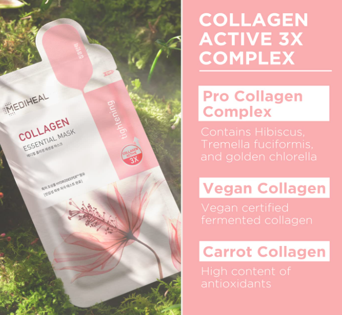COLLAGEN ACTIVE 3X COMPLEX - firms, visibly plumps and helps increase skin's elasticity for younger looking skin. Vegan Collagen, Pro Collagen Complex (Hibiscus Flower Extracts, Snow Mushroom Polysaccharides and Chlorella) and Carrot Collagen extracted from Jeju carrots intensely firms and diminishes the appearance of fine lines and wrinkles.