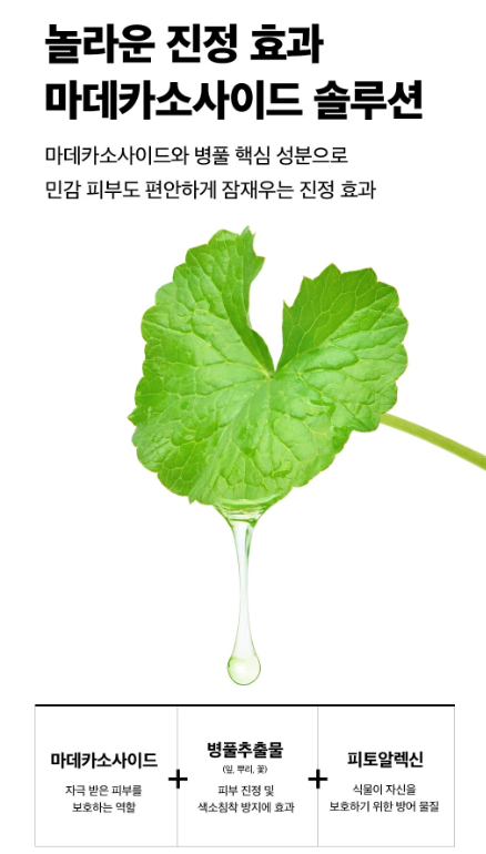 피부 진정: 병풀 추출물에서 유래한 마데카소사이드 성분을 98%의 고순도로 함유하고 있어, 붉은기와 염증 완화 등 피부 진정 효과가 뛰어납니다.