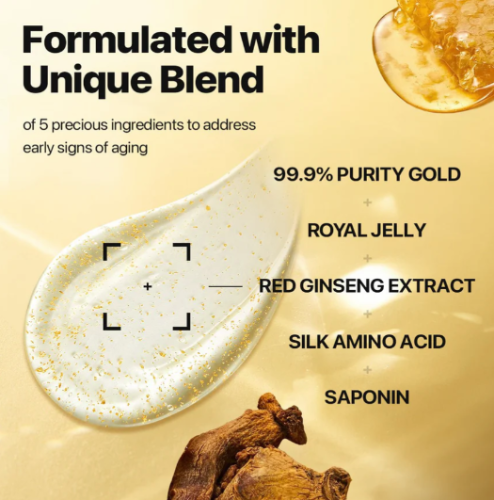 Key Components: Contains 99.9% 24K Gold, 6-year-old Red Ginseng, Royal Jelly, and Silk Amino Acids.