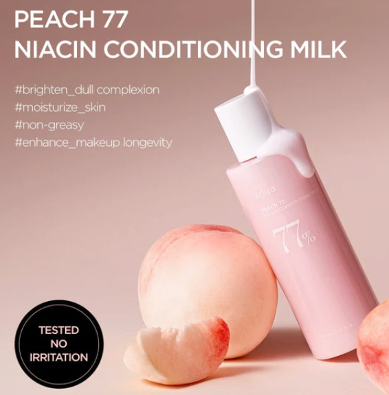 ANUA Peach 77 Niacin Conditioning Milk (150ml) is a brightening and hydrating lotion designed to provide a "glass skin" finish using fermented peach extract and niacinamide