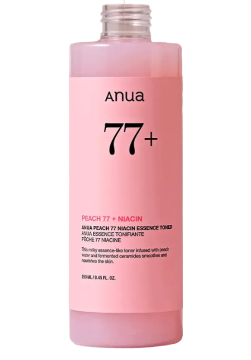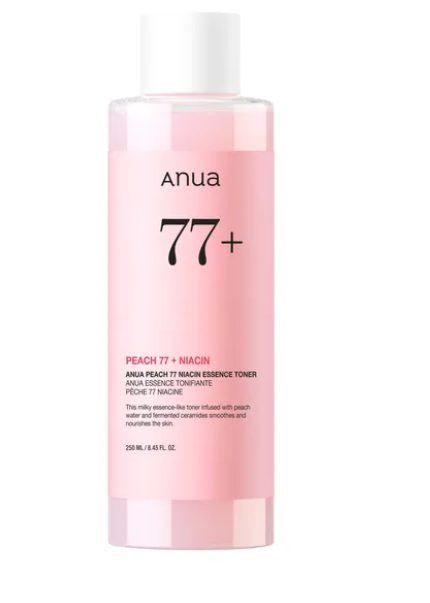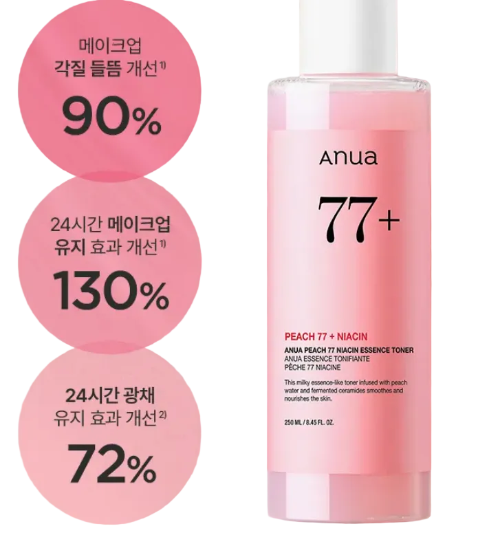 ANUA피치 77 나이아신 에센스 토너 250ml는 복숭아 추출물 77%와 나이아신아마이드를 함유하여 피부 결 케어와 수분 공급, 미백 효과를 동시에 제공하는 제품입니다