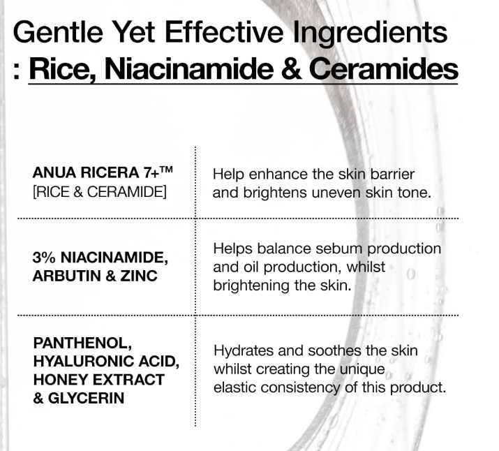 Full Ingredient List Oryza Sativa (Rice) Bran Water, Dipropylene Glycol, Glycerin, Methylpropanediol, Water, Butylene Glycol, Methyl Gluceth-10, Niacinamide, 1,2-Hexanediol, Panthenol, Hydroxyethyl Urea, Pentylene Glycol, Sodium Polyacrylate, Oryza Sativa (Rice) Extract, Caprylic/Capric Triglyceride, Carbomer, Hydrogenated Lecithin, Ethylhexylglycerin, Polyquaternium-51, Adenosine, Allantoin, Sodium Phytate, Xanthan Gum, Ceramide NP, Sodium Hyaluronate, Alpha-Arbutin, Angelica Keiskei Extract, Corchorus Olitorius Leaf Extract, Dioscorea Japonica Root Extract, Hibiscus Esculentus Fruit Extract, Nelumbo Nucifera Root Extract, Beta-Glucan, Tocopherol, Defatted Rice Bran Extract, Arbutin, Zinc Stearate, Defatted Rice Bran, Oryza Sativa (Rice) Bran, Hydrolyzed Rice Protein, Oryza Sativa (Rice) Seed Protein, Honey Extract, Hyaluronic Acid, Hydrolyzed Hyaluronic Acid.