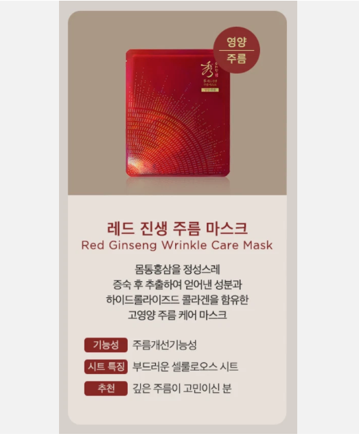 The product you are likely referring to is the Sooryehan Red Ginseng Wrinkle Care Mask, a Korean skincare product designed to combat signs of aging using red ginseng extract and hydrolyzed collagen.