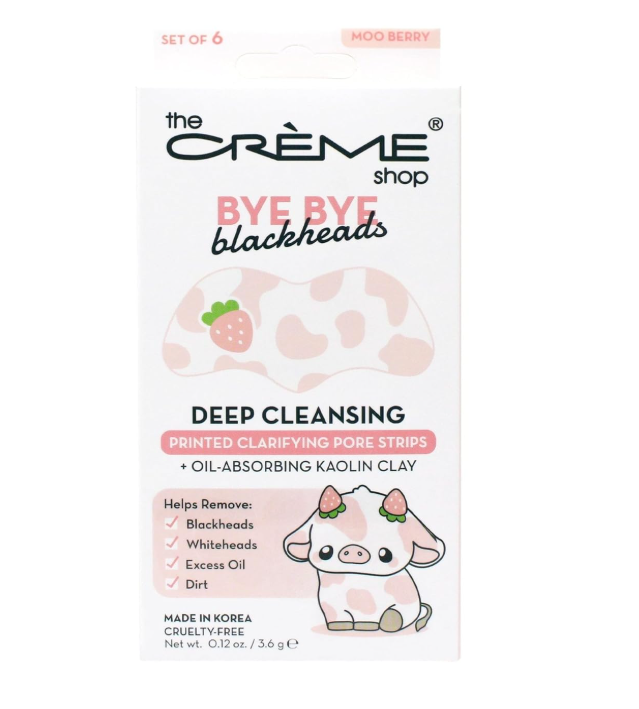 The product you are looking for is The Crème Shop Bye Bye Blackheads Printed Nose Strips in the Moo Berry scent, which helps remove blackheads, whiteheads, excess oil, and dirt.
