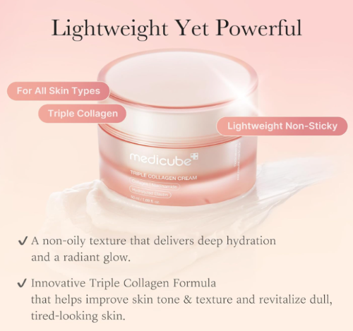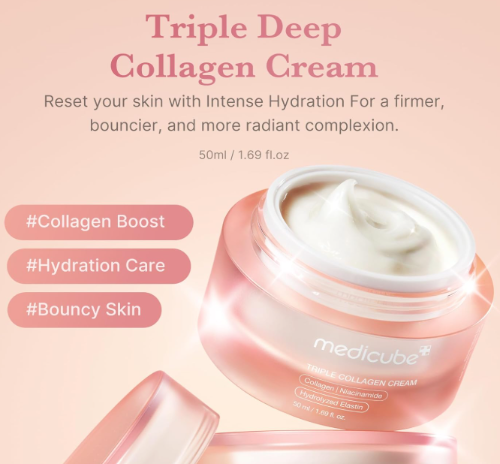 he Medicube Triple Collagen Cream 4.0 (50ml) is a high-performance Korean anti-aging moisturizer designed to restore skin elasticity and provide deep hydration. Updated for 2025, it targets sagging skin, fine lines, and enlarged pores
