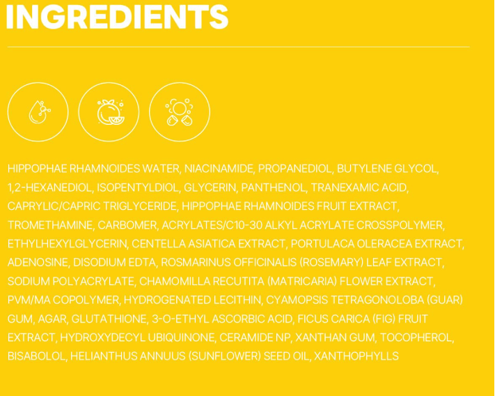 - Triple Vita Activer™: A unique blend including Seaberry (Hippophae Rhamnoides) Water, fruit extract, and stabilized Vitamin C (3-O-Ethyl Ascorbic Acid).