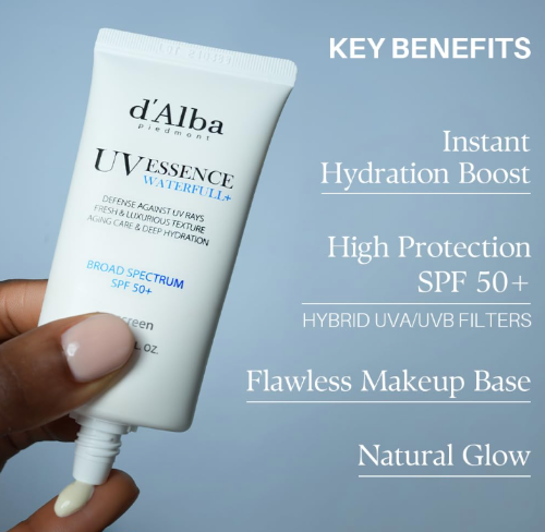 The d'Alba Waterfull Essence Sunscreen (50ml) is a multi-award-winning, vegan-certified sunscreen celebrated for its lightweight, serum-like texture that provides deep hydration without any white cast or stickiness