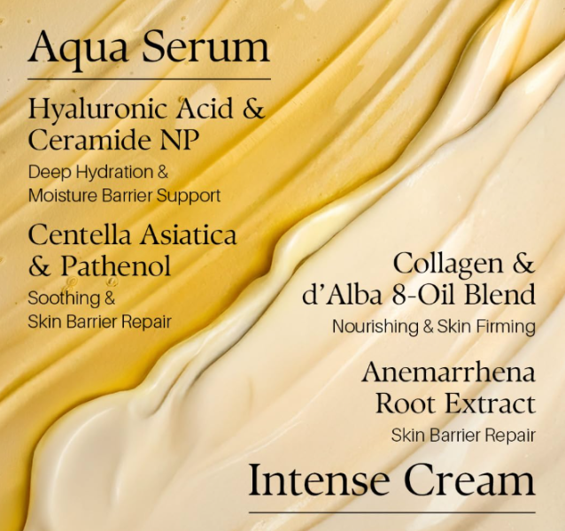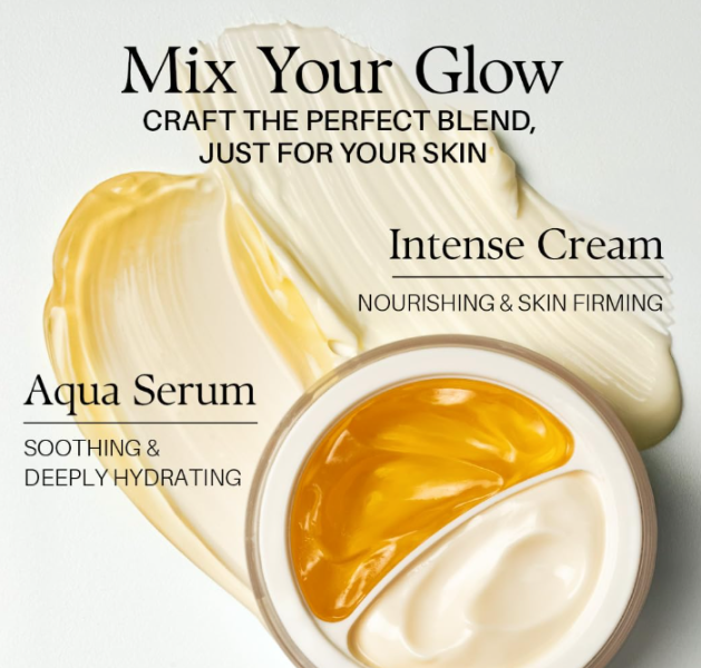 At the final step of your skincare routine, use the included spatula to mix the Aqua Serum and Intense Cream. For a hydrating finish (oily skin or humid days), use a 2:1 ratio of serum to cream. For an intensive nourishing finish (dry skin or cold weather), use a 1:2 ratio. For a balanced state, a 1:1 ratio is recommended. Gently apply the mixture to the face and neck until absorbed.